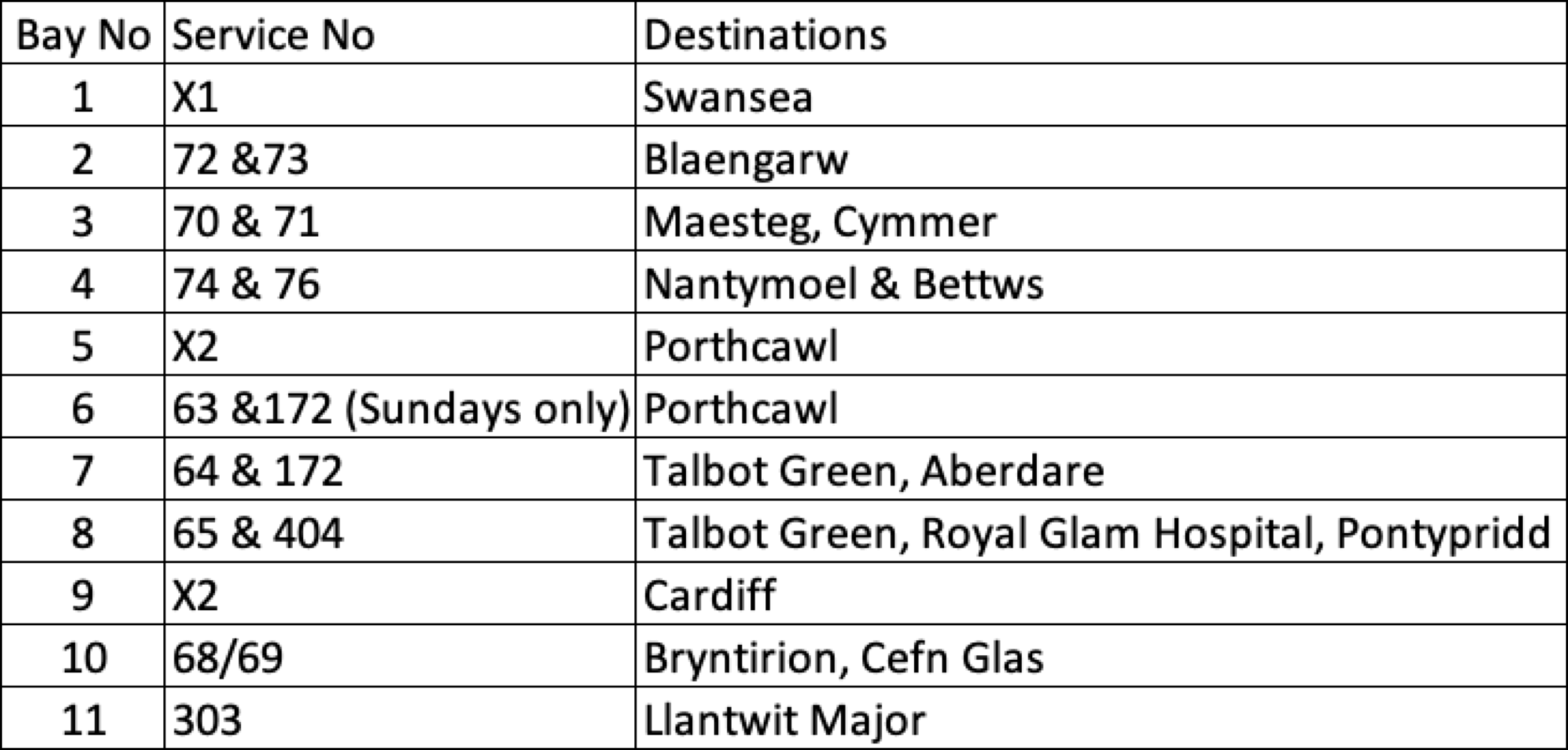The following services depart from Bays 1 to 11 on Monday to Sunday,